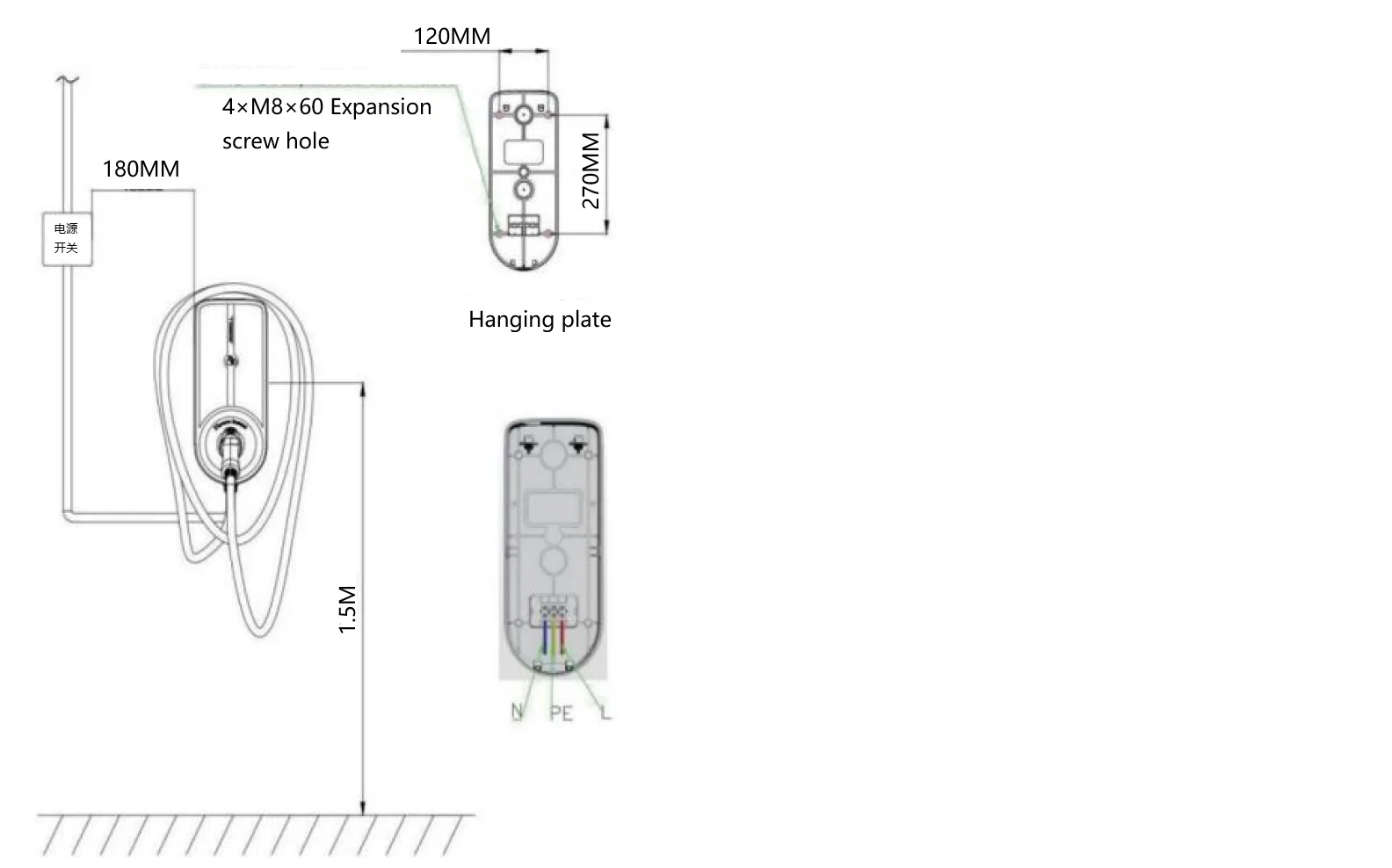 1) A töltőcölöp talajtól mért magasságának referenciaadatai (1,3-1,5 méter)2) Jelölje be a falon a hátlapon a rögzítőfurat helyzetét a hátlapon lévő rögzítőfurat helyzetének megfelelően.